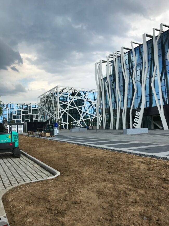 QBIK Center von Hertner in Heilbronn: Erdarbeiten Flächenbefestigungen, Erdarbeiten Gräben; Fundamente, Kanal-Rohrleitungsbau, Entwässerungsrinnen, Betonplatten-/Betonpflasterbeläge, Asphaltflächen, Beleuchtungsmasten uvm.