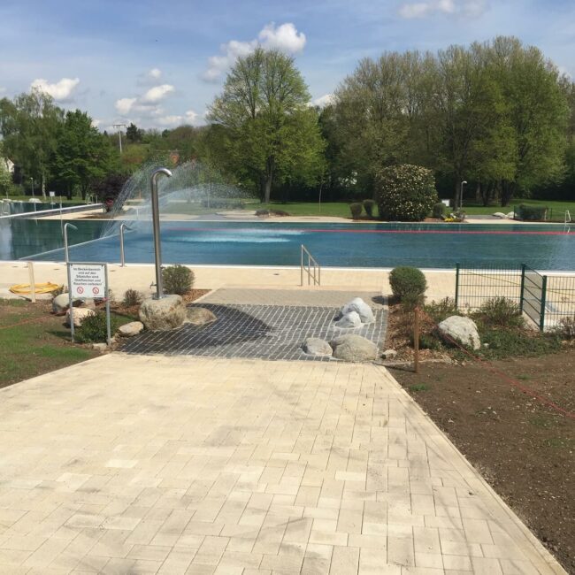Freibad in Gemmingen: Erdarbeiten, Kanalarbeiten, Pflasterbau & Wegebau, Entwässerungsrinnen, Betonplatten-/Betonpflasterbeläge, Asphaltflächen, Grünflächen, Rasen & Bäume…